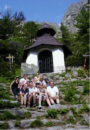 blížili do stanice Žilina, kde sme čakali prírastok našej družiny v podobe Lenky / strážkyňa svätyne nášho riaditeľa i samotného nášho riaditeľa, naše spojivo medzi vrchnosťou a spodnosťou, naša sťahovavá lastovička, vzťah ku kolektívu veľmi družný až súdržný/. Z okna sme sa jej zviditeľnili a tým jej uľahčili nastupovanie. Tradičné uvítanie chlebom a soľou sme oželeli a Lenku uvítali, tiež tradične slovensky - destilátom. Rýchlo plynúcu cestu spríjemnila panoráma Malej Fatry, Veľkej Fatry, Nízkych Tatier osviežili nás vody Liptovskej Mary a zatajili sme dych pri pohľade na Vysoké Tatry- naša budúca kolónia. Turistická sezóna práve začala a tak sme svojím organizovaným chaosom urobili prvú zaťažkávajúcu skúšku Popradskej stanici, ako i tatranskej železnici. Priznám sa, že Tatry ma zasa veľmi potešili, vlastne opantali ako vždy a zdôraznili tú našu človečenskú malosť. Ani sme sa nenazdali a vystupovali sme na konečnej a to bolo Štrbské pleso - naša destinácia. Skorý príchod cca11:00 neprekvapil iba nás, ale aj zamestnancov malebného hotelíka Toliar. S morálkou, ktorá panovala nás skôr považovali skôr za okupačné vojská ako za potencionálnych turistov.